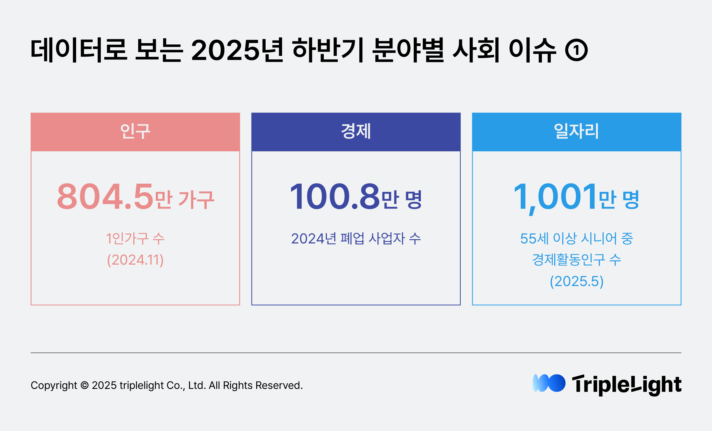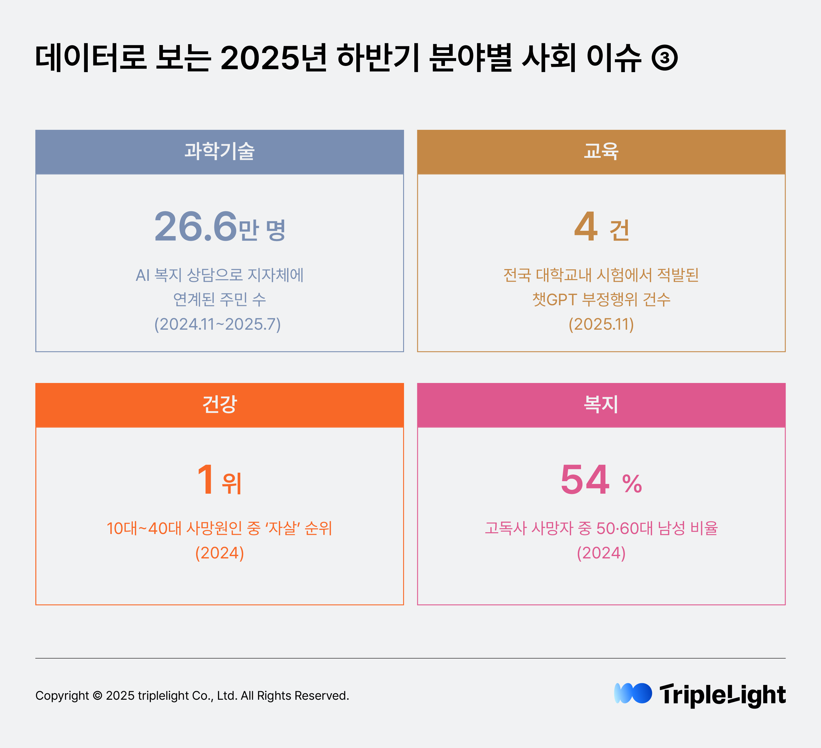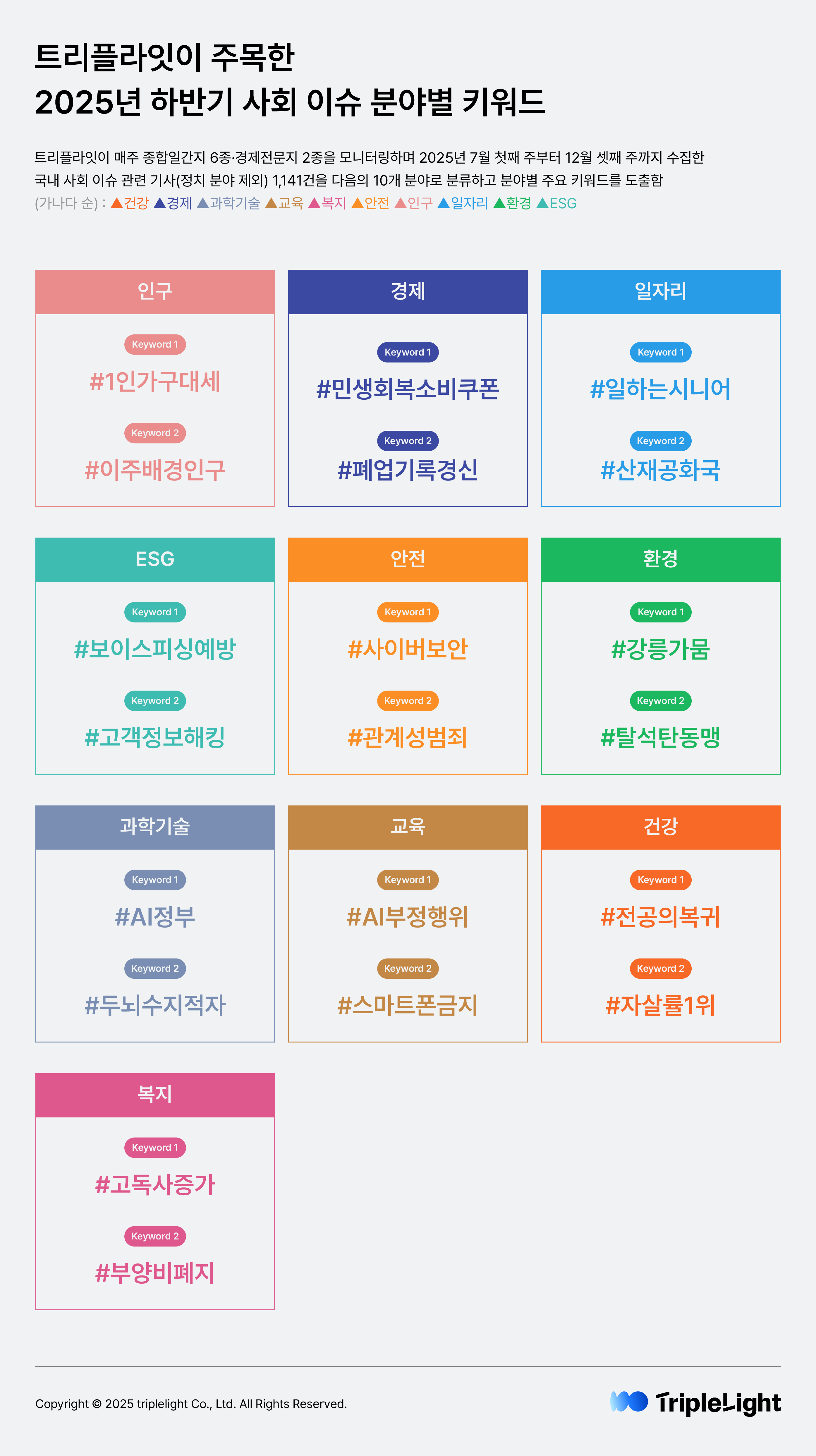 20개 키워드로 2025년 한국 사회 이슈를 되돌아봅니다. 트리플라잇 구성원들이 7월 첫째 주부터 12월 셋째 주까지 25주에 걸쳐 수집한 10개 분야 뉴스 1,141건*을 종합해 언론에서 가장 주목한 이슈를 선별했습니다.