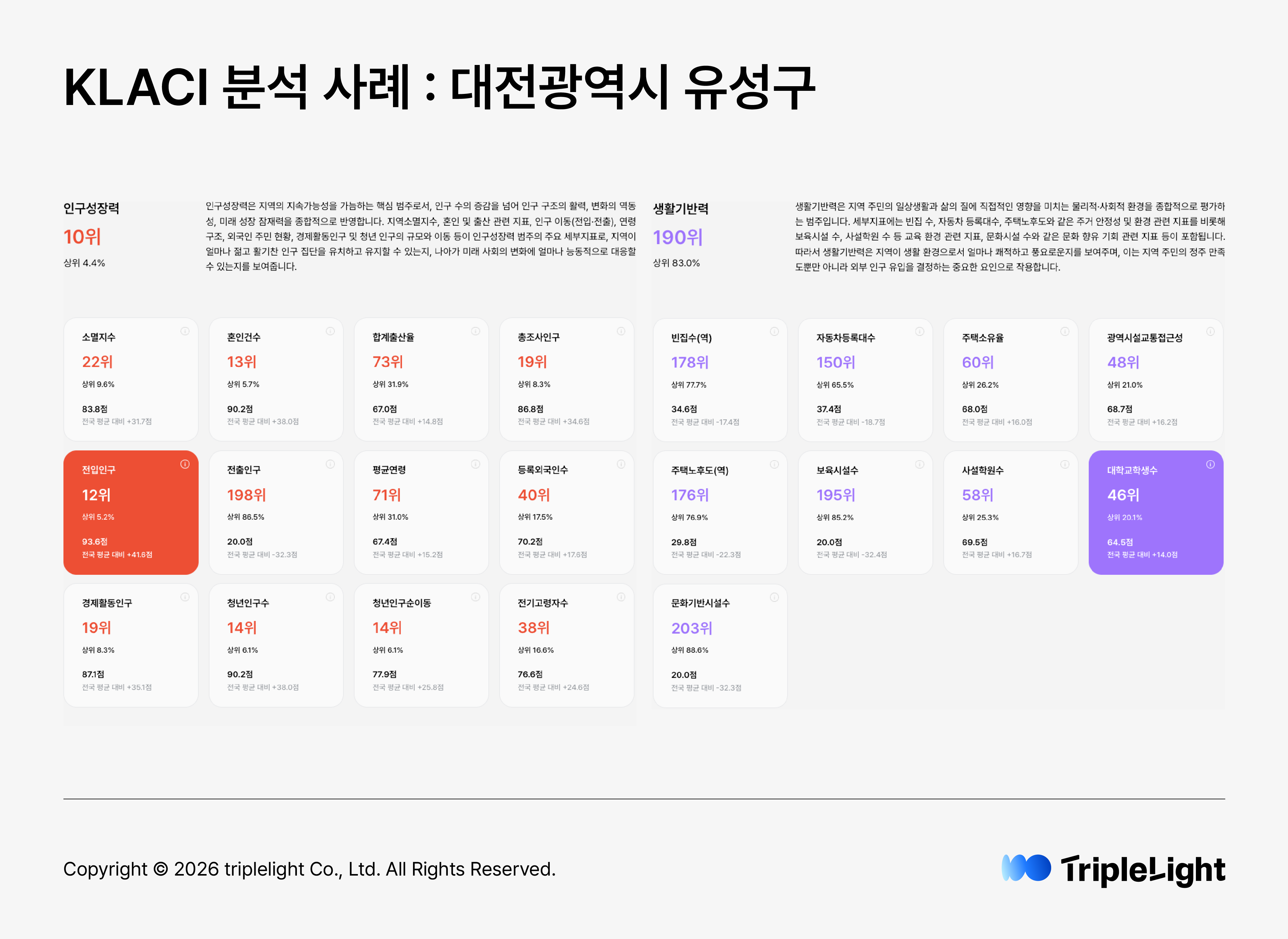 트리플라잇은 그동안 ‘데이터’로 가장 심각하고 중대한 문제를 진단하고, 이를 토대로 실질적이고 효과적인 해결책을 모색하는 데 필요한 인사이트와 전략을 제안해왔는데요, KLACI라는 데이터 기반 지역 현황 진단 도구를 개발한 이유도 위기에 놓인 지자체들이 ‘진짜’ 문제를 찾아 ‘제대로 된’ 솔루션을 마련하도록 돕기 위해서입니다. 이처럼 국가 단위가 아닌, 전국 229개 지자체 단위의 데이터 분석에 주력한 것은 보다 면밀하게 실제 ‘삶의 질’을 좌우하는 요인들의 변화를 파악하기 위해서였습니다. 이은화 대표는 “OECD는 보다 면밀한 삶의 질 측정을 위해 ‘지역웰빙지수(Regional Well-being Index)’를 발표하고 있다”면서 “같은 나라 안에서도 지역마다 삶의 질은 다르게 나타나며, 삶의 질을 결정하는 요소 또한 다양하게 조합되므로 삶의 질을 개선하기 위해서는 사람들의 실질적 삶의 터전인 ‘지역’을 더 나은 곳으로 만들어야 한다는 관점”이라고 설명했습니다.