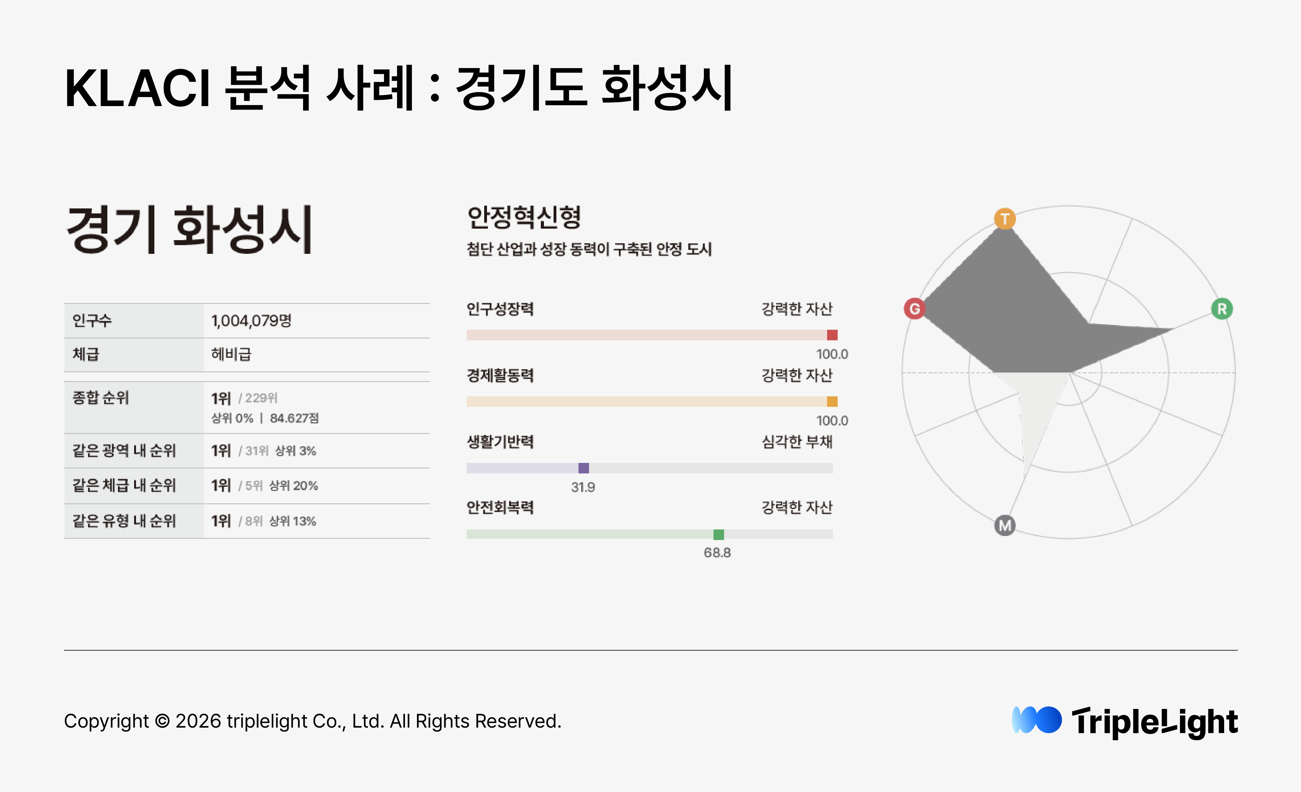경기도 화성시는 KLACI 분석 결과 종합 순위 1위를 기록했으며, KLACI의 4대 범주 중 인구(인구성장력)과 경제(경제활동력) 부문에서도 전국 1위를 차지했습니다. 꾸준히 늘어나는 인구, 탄탄한 지역 재정과 첨단산업에서 창출되는 일자리, 우수한 교통망과 풍부한 생활편의시설을 갖춘 안정적인 생활 환경이 서로 선순환하며 성장 동력을 만들어내는 모습입니다.