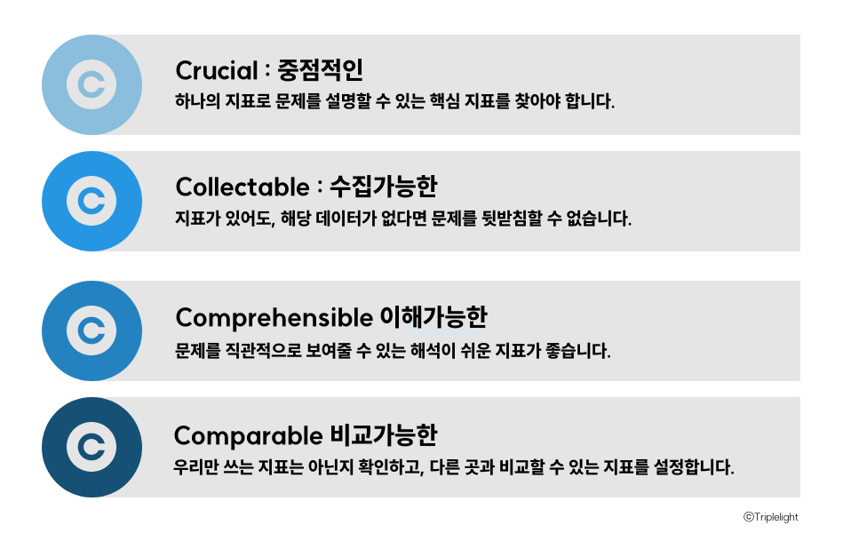 아래는 트리플라잇이 핵심 지표를 설정할 때 중요하게 생각하는 4C입니다. 문제를 보여주는 보다 객관적이고 설득력 있는 지표를 찾고 싶다면, 아래 사항들을 점검해 보세요.