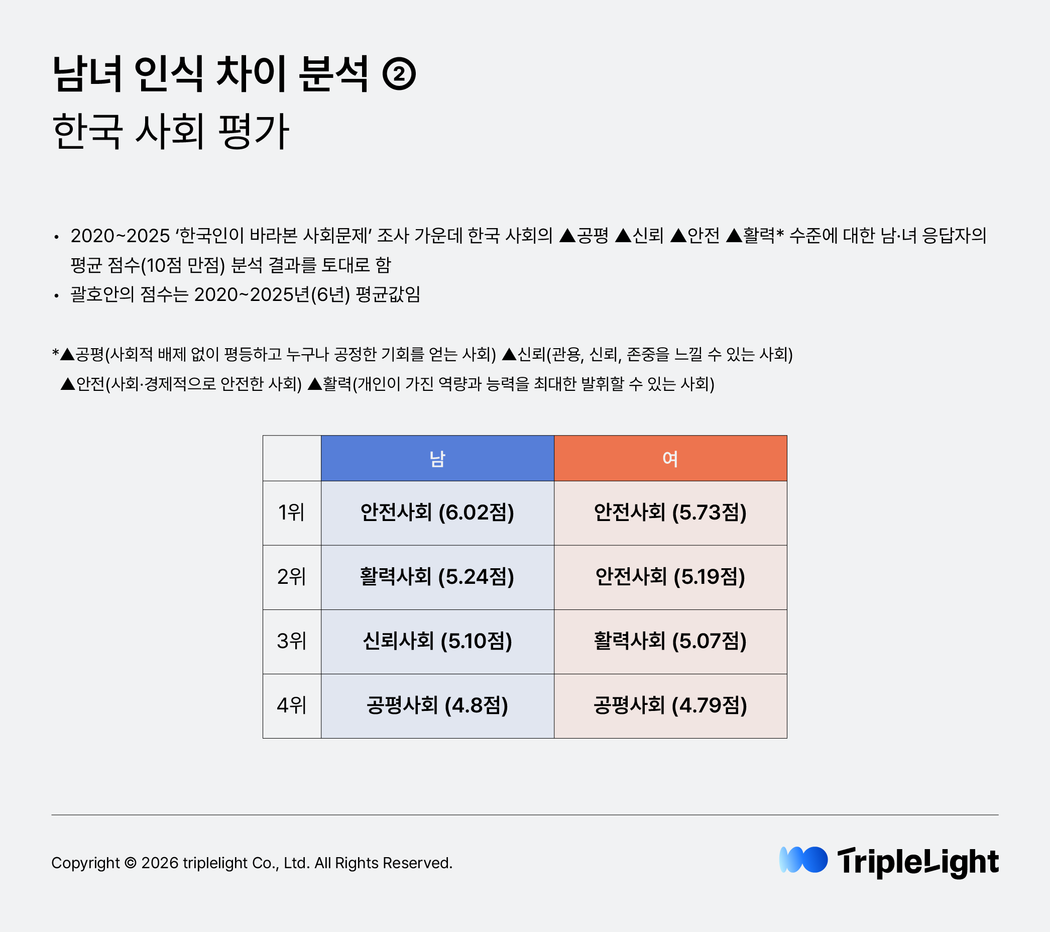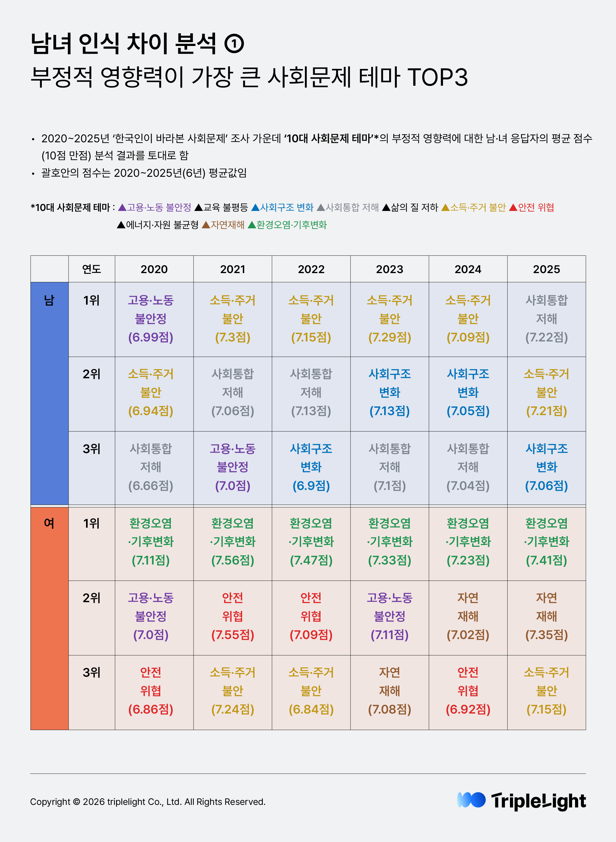 트리플라잇과 사회적가치연구원(CSES)은 전국 20세 이상 남녀 1,000명 대상 설문조사를 바탕으로 ‘한국인이 바라본 사회문제’ 보고서를 발행하고 있습니다. 해마다 보고서에서 남녀 간 인식 차이가 ‘특히’ 두드러지는 결과를 선별해 소개해왔는데요, ‘국제 여성의 날’(3월 8일)을 맞이해 지난 2020년부터 2025년까지 6년에 걸친 ‘한국인이 바라본 사회문제’ 연구 데이터를 펼쳐놓고, 핵심 지표에 대한 남녀 응답을 비교·분석해봤습니다.