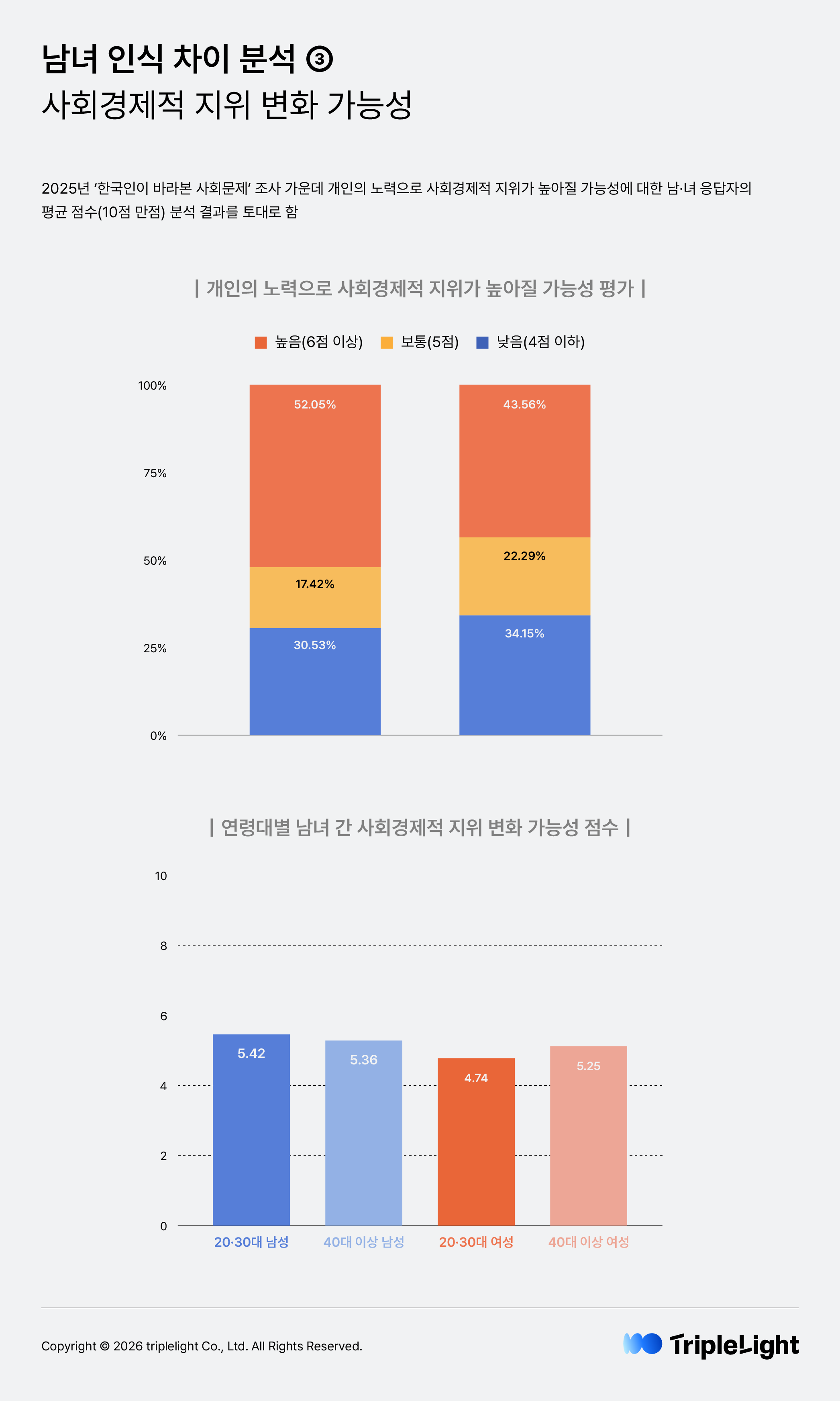 개인의 노력으로 사회경제적 지위가 높아질 가능성에 대한 평가는 2025년에 새로 추가된 문항으로, 조사 결과 성별뿐만 아니라 세대에 따라서도 인식 수준이 다르게 나타났습니다. 개인의 노력으로 사회경제적 지위가 상승할 가능성이 ‘높다’고 느끼는 응답자 비율은 남성의 경우 절반을 조금 넘는 52.05%, 여성의 경우 절반에 못 미치는 43.56%였고, 가능성이 ‘낮다’고 느끼는 응답자 비율은 여성(34.15%)이 남성(30.53%)보다 높았습니다. 즉 남성 응답자에 비해 여성 응답자가 개인의 노력으로 사회경제적 지위가 높아질 가능성을 더 낮게 인식하고 있는 건데요, 여성 응답자 중에서도 20·30대는 그 가능성을 더욱 부정적으로 평가하고 있었습니다. 20·30대 여성 응답자의 사회경제적 지위 상승 가능성에 대한 평가 점수(10점 만점)는 4.74점으로, 동일 연령대 남성 응답자(5.42점) 대비 0.7점 가량 낮았습니다.