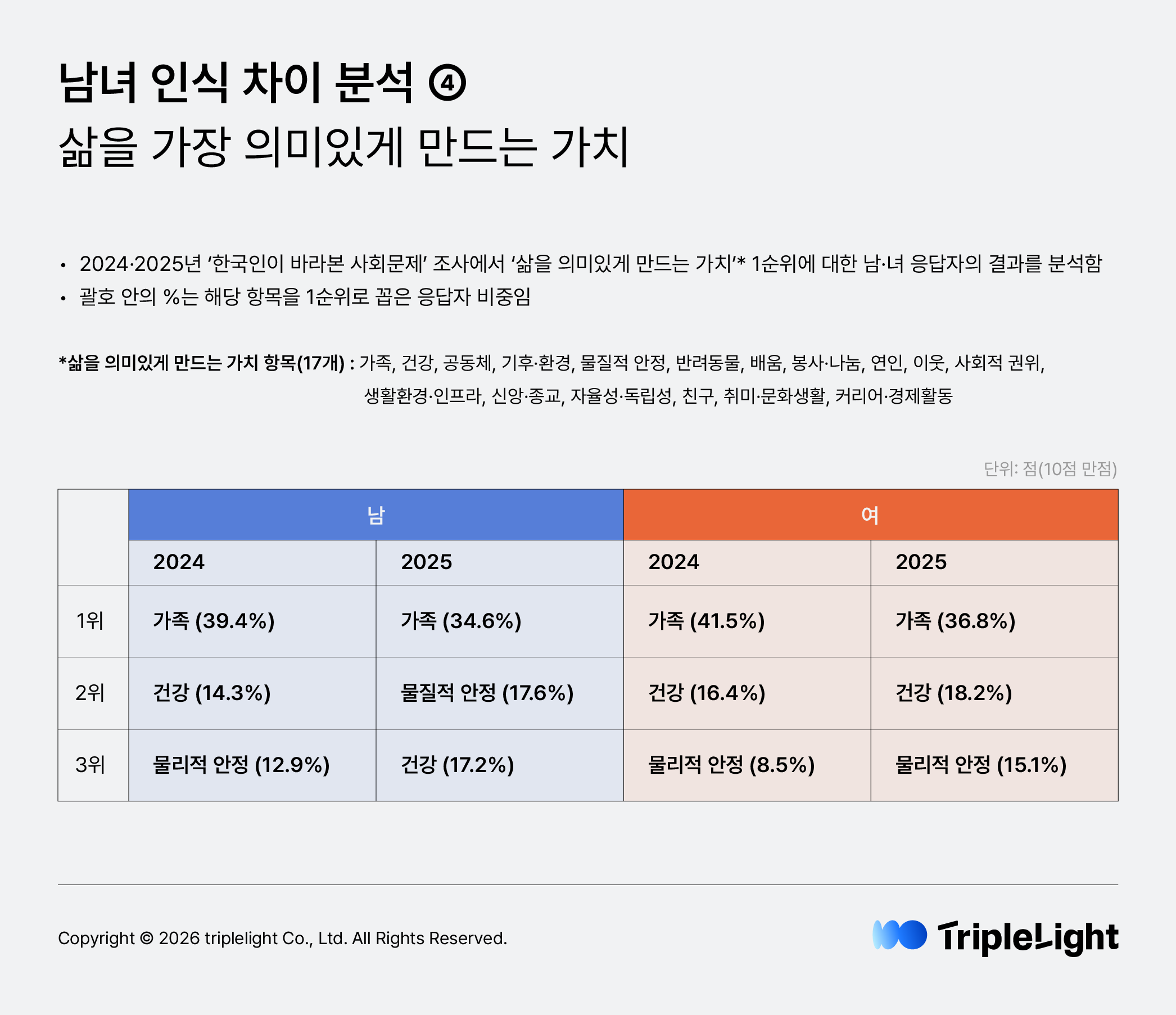 2024년부터는 ‘나의 삶을 의미 있게 만드는 가치’를 묻는 질문을 추가하고, ▲가족 ▲건강 ▲물질적 안정 ▲취미·문화생활 ▲커리어·경제활동 등 총 17개 항목을 응답 선택지로 제시했습니다. 2024~2025년 조사 결과 성별을 불문하고 ‘가족’을 삶에서 가장 가치 있는 요소로 꼽은 가운데 ‘건강’과 ‘물질적 안정’이 그 뒤를 이었습니다. 남녀 응답자 모두 삶에서 ‘가족’, ‘건강’, ‘물질적 안정’을 가장 중요한 가치로 생각하고 있습니다. 특히 여성 응답자의 경우 ‘생활환경·인프라’, ‘신앙·종교’, ‘반려동물’, ‘기후·환경’을 남성 응답자에 비해 상대적으로 더 중요하게 생각하는 경향이 있었습니다.
