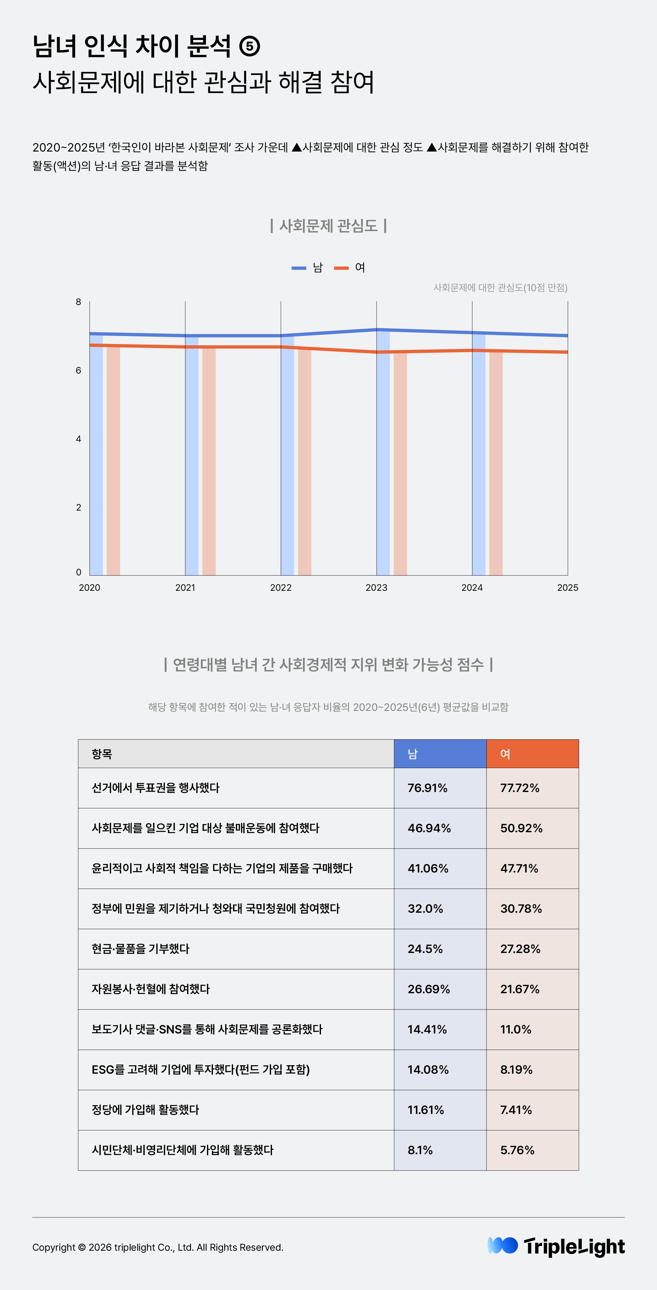 사회문제에 대한 관심도는 2020년부터 줄곧 남성이 여성에 비해 더 높은 수준을 유지하고 있습니다. 한편 사회문제를 해결하기 위한 활동 참여율은 전반적으로 남녀 간 차이가 미미한 편입니다. 특히, 참여율 평균이 40% 이상인 ‘투표’, ‘불매운동’, ‘윤리적 소비’와 같은 활동의 경우 여성 응답자의 참여율이 남성 응답자 보다 높은 편이었고, ‘기부’ 활동에도 남성 응답자보다는 여성 응답자가 더 많이 참여하는 것으로 나타났습니다. 그런가 하면 남성 응답자의 경우 ‘민원·청원’, ‘봉사·헌혈’, ‘이슈 공론화’, ‘투자’, ‘정당 가입’, '시민단체 가입’과 같은 활동에 여성 응답자보다 더 많이 참여하고 있었습니다.
